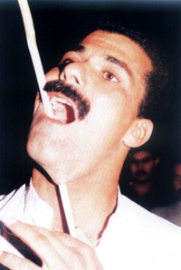 صورة 8: أحد المريدين يأكل زجاج لمبة "فلوريسان" كهربائية. (إلى يمين الصورة، يبدو جالسًا الشيخ عبد الكريم الكَسْنَزاني الحسيني، أستاذ الطريقة القادرية الكَسْنَزانية.) إن فعاليات الشفاء الخارق للإضرار المتعمَّد إحداثه في الجسم، التي يقوم بها دراويش الطريقة الكَسْنَزانية، لا تتضمن إصلاح الضرر الجسمي المتعمَّد فقط؛ إذ إن الدراويش يمارسون فعاليات أخرى تُطلَق عليها تسمية "مقاومة الضرر الجسمي المتعمَّد" Resistance to Deliberately Caused Bodily Damage، لأن هذه الفعاليات تُبيِّن قابليةً خارقةً للجسم على مقاومة الإصابة التي من المفروض أن تنتج لدى التعرُّض لمؤثرات مؤذية معيَّنة. أي أن الضرر لا يحدث أصلاً في هذا النوع من فعاليات الدرباشة؛ وهي بذلك تختلف عن النوع الأول من فعاليات الدرباشة التي تتضمن إصلاحًا خارقًا لضَرَرٍ جسميٍّ تمَّ إحداثُه قصدًا. تتمثَّل ظواهرُ مقاومة الضَّرر الجسمي المُتعمَّد في الطريقة الكَسْنَزانية في الفعاليات التالية: 1. مقاومة النار: هناك أشكال متعددة لممارسة هذه الفعالية؛ إلا أن أكثرها شيوعًا بين الدراويش، بسبب سهولة ممارسته والخطورة الكبيرة التي يتضمَّنها، هو استخدام قطعة من القماش ملفوفة على عصا خشبية أو معدنية، تُغمَر في مادة سريعة الاشتعال، كالنفط، وتوقَد فيها النار، ليقوم الدرويش بعدها بتعريض وجهه ويديه وأقدامه لِلَهَب هذه النار (صورة 9). والشكل الآخر لهذه الظاهرة هو تسخين صفائح معدنية حتى الاحمرار، وقيام الدراويش بِحَمْلِها بأيديهم ووَضْعِها بين أسنانهم. من الجدير بالذكر هنا هو أنه عند ممارسة الدرويش لأيٍّ من الفعاليتين أعلاه يكون في إمكان أيِّ شخص آخر أن يشعر بالحرارة العالية التي تشعُّ من مصدر النار المستخدَم على بُعد أكثر من متر؛ إلا أن جسم الدرويش المتعرِّض للنار تعريضًا مباشرًا لا يُصاب بحروق. ومن الأشكال الأخرى لممارسة هذه الفعالية هي حَمْلُ الدرويش بيد عارية قطعًا من الفحم الساخن حتى الاحمرار ووضعها في فمه أيضًا. وإضافةً إلى خطر الاحتراق، تتضمن هذه الممارسة خطرًا إضافيًّا على الدرويش، يتمثل في استنشاقه غاز أول أكسيد الكربون السام الذي ينبعث من احتراق قطعة الفحم داخل الفم. من الواضح أن هذه الفعاليات تتضمَّن مناعةً ضد النار، وفي حالة الفحم المتِّقد، مناعةً ضد غاز سامٍّ أيضًا.