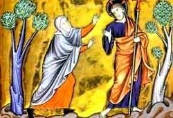 "يسوع يتراءى لمريم المجدلية" (منمنمة في مخطوط من العصر الوسيط) إن الأسلوب الغنوصي، في رواية الإنجيل بحسب يوحنا، ألحقَ شبهةً على تاريخيَّته. ولكن واقعها أرغم العلماء على الإقرار بـ"تاريخيةٍ" فيه أعمق وأشمل من الأناجيل المؤتلفة الثلاثة. فينقل بتفصيل المشاهدَ الثلاثة التي عاين فيها أتباعُ المسيح رجوعَه إلى الحياة، ومعايشتَه لهم مدةً من الزمن، قبل ارتفاعه إلى السماء: كيف ظهر للمجدلية مكافأةً لها على إسراعها قبل الجميع لزيارة قبره، وكيف حدَّثها حديث الأحياء (20: 11-18)؛ وكيف ظهر المرَّة الأولى للرسل الصحابة، و"الأبواب موصدة خوفًا من اليهود"، وكيف أراهم الشهادة الحسية التي لا يمكن لهم أن يكذِّبوها أو يتوهَّموا فيها: "أراهم يديه وجنبه، ففرح التلاميذ لمشاهدة الرب"، وأعطاهم سلطان الغفران يعيشون منه عِبْر الدهور (20: 19-23)؛ وكيف ظهر لهم ثانية، وقد سمع في الغيب جحودَ توما لبُشرى رفاقه، "فوقف في الوسط وقال: السلام عليكم! [كما كان يحيِّيهم على حياته بحسب البشرية] ثم قال لتوما: هاتِ إصبعك إلى هاهنا وانظر يديَّ، وهاتِ يدك وضَعْها في جنبي، ولا تكن جاحدًا بل كن مؤمنًا"، وكيف صُعِقَ توما للرؤية، وقد تحقق بنفسه حقيقةَ قيامة المسيح، ومعرفته للغيب، فاستيقظتْ في وعيه تعاليمُ المسيح عن حقيقة شخصيته، "فقال له: ربي وإلهي!" (20: 24-29). وأضاف إليها مشهدًا آخر يُظهِر مخالطةَ المسيح الحيِّ لهم بعد موته، وهو يهبط عليهم من وراء الغيب، يهيِّئ لهم طعامًا، ويأكل منه معهم، ثم يخبرهم بمصائرهم (الإصحاح 21). تلك شهادة الواقع التي فيها يمارون! 2. كيفية القيامة وكيفية القيامة هي، بعد الحدث الضخم نفسه، مصدرُ الشبهات. وكأن أهل العلم والنقد استفاقوا لها وحدهم اليوم. وفاتَهم أن العقل اليوناني، المائل بوثنيَّته إلى الجحود أكثر منا اليوم، أُرغِمَ على القبول بحقيقة قيامة المسيح. نجد الوثائق على ذلك عند لوقا وبولس، ربيبَي الثقافة اليونانية والرومانية والشاهدَيْن فيها بدعوة القيامة. كان لوقا طبيبًا وأديبًا من أنطاكية العظمى في سورية، العاصمة الثالثة – بعد أثينة والإسكندرية – للثقافة الهلِّنستية؛ وفيها اهتدى على يد بولس، فكان رفيقه وطبيبه والأمين على دعوته. فقام بتحقيق تاريخي لسيرة السيد المسيح ودعوته (1: 1-4). لم يكتفِ بما نقله مرقس (لوقا 24: 1-12)، بل أضاف إليه شهادةَ أهل البيت، أبناء عمٍّ المسيح، – هم الذين كانوا به على حياته كافرين – فنقل ظهورَ المسيح لعمِّه قلوبَّا وابنه يعقوب، زعيم أهل البيت والأسقف الأول على المدينة المقدسة، لكن لوقا أغفل اسمه تقيَّةً. ظهر لهما المسيح صباح الأحد حين كانا راجعين يائسين إلى بيتهما في عَماوس، إلى الشمال الغربي من أورشليم، وقد انهارت كل آمالهما مع صلب المسيح وموته وقبره. ولا جرم أن الفصل الذي ينقل خبر ظهور يسوع لهما (24: 13-35) هو من الأدب الرفيع والپسيكولوجية الطبيَّة العميقة. سار يسوع الحيُّ بعد الموت معهما، يتحدثون في المأساة المذهلة. والصدمة الكبرى في إيمان اليهود أن المسيح حيٌّ خالد لا يموت (يوحنا 12: 34)؛ فكيف صُلِبَ ومات، وهو يدَّعي أنه المسيح الموعود؟! فشرح لهما، من التوراة و"النبيِّيم" (كُتب الأنبياء)، "مما يختص به في الأسفار كلها": فبناءً عليه، "كان على المسيح أن يكابد هذه الآلام ويدخل مجده". ولمَّا أرغما يسوعَ على استضافتهما، بحسب العادة الشرقية، وحَضَرَ الطعامُ، فعل أمامهما كما كان يفعل دائمًا في حياته: "اتكأ معهما، وأخذ الخبز، فبارك وكسر وناولهما. فانفتحتْ أعينُهما وعرفاه، ولكنه غاب عنهما"، كما حضر بينهما. فرجعا للحال إلى أورشليم يخبران التلاميذ بما جرى لهما، فبادروهما بالبشرى: "لقد قام الرب وظهر لسمعان." ظهر يسوع قبل الجميع لزعيم الصحابة، سمعان بطرس، ولزعيم أهل البيت، يعقوب، وأبيه قلوبَّا.