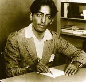 كريشنامورتي في ريو دي جانيرو، 1935. بيد أنه في الفترة التي نشبت فيها الحرب العالمية الثانية أُرغِمَ على البقاء في كاليفورنيا. وهناك، ظلَّ معظم سنوات الحرب بمفرده، يزرع الورد ويحلب البقر ويأكل من جَنى يديه، كأيِّ مزارع عادي. لكنه، من الداخل، كان حيًّا، ينصت، يرصد، يسائل العالم من حوله وفي داخله. وفي صمت النزهات التي كان يقوم بها بدأ التعليم، كما عُرِفَ فيما بعد، يتفتح. وقام كريشنامورتي بصوغ لغة مطواعة تجسِّد "فكره" وتفصح عن مقاصده على نحو موضوعي مستقلٍّ عن شخصه.
